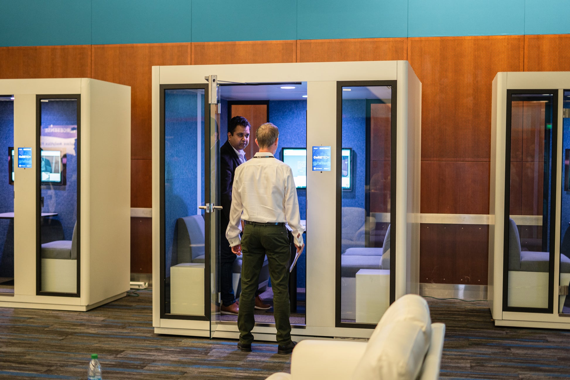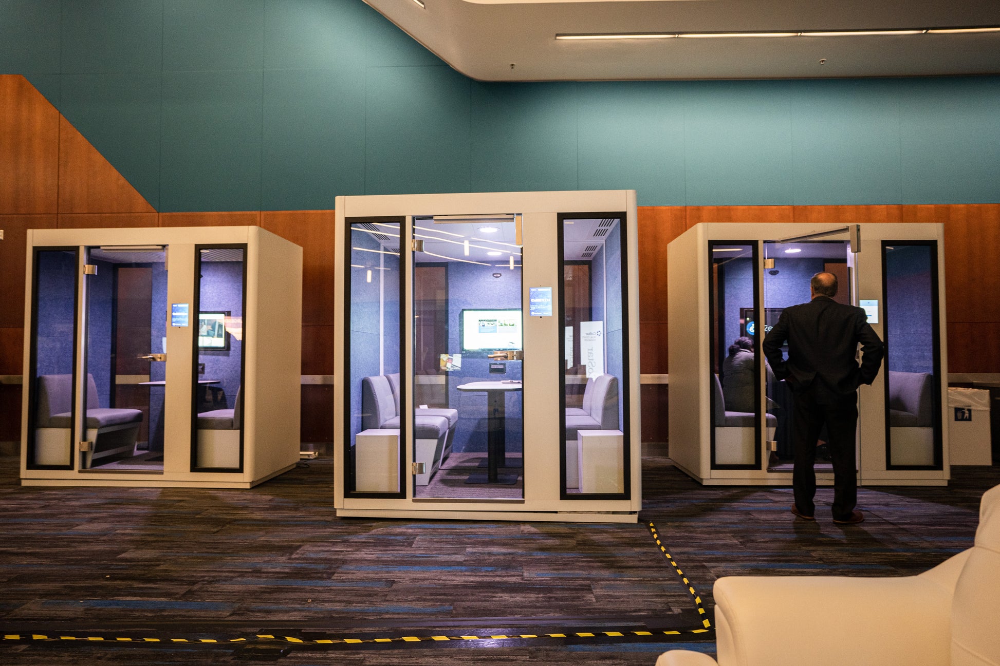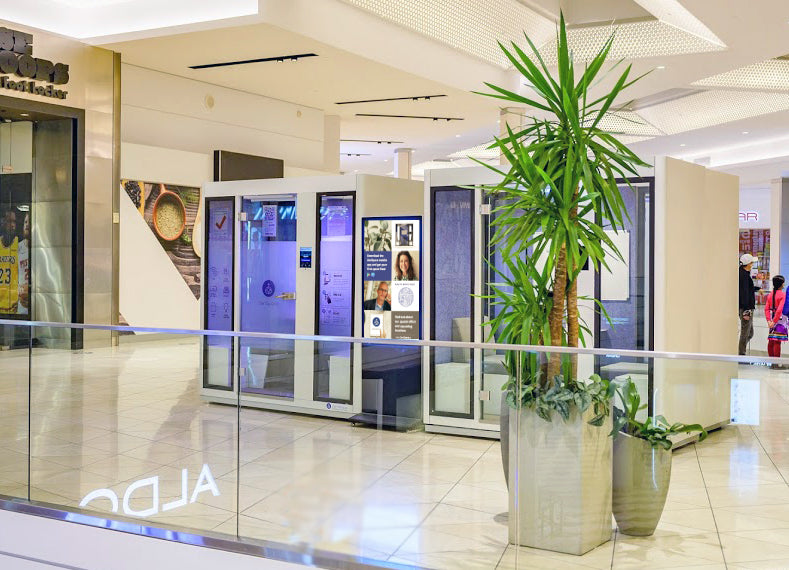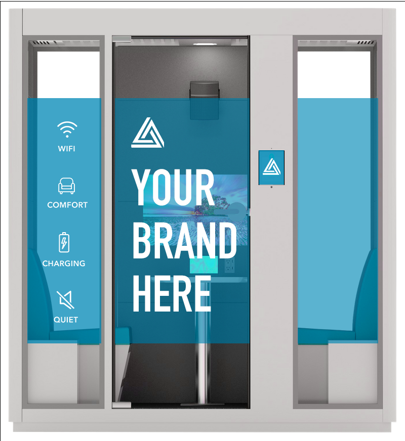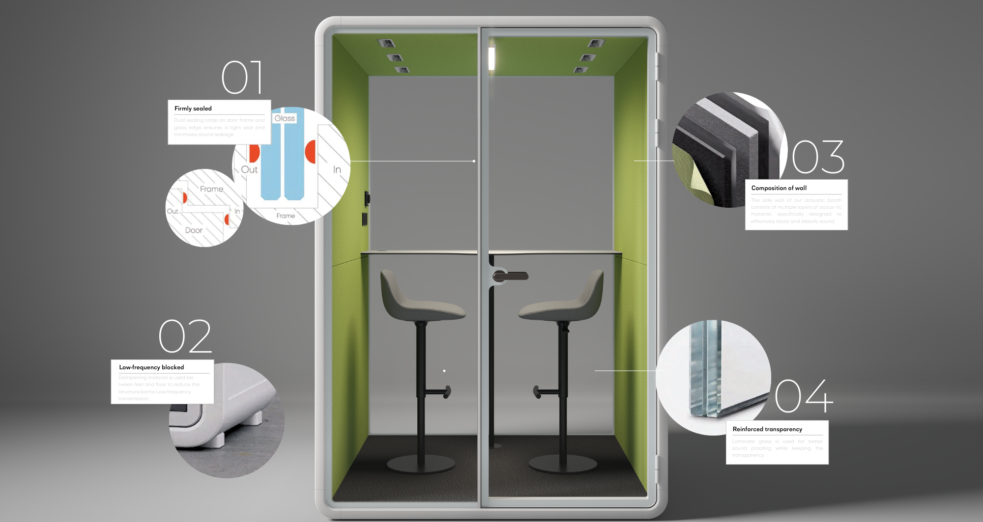 Aura pods feature dual sealing strips, multi-layered acoustic walls, and dampening materials to block low-frequency noise, achieving a speech level reduction of over 29dB. This ensures a quiet, private workspace by minimizing sound leakage and maintaining transparency with laminated glass.
