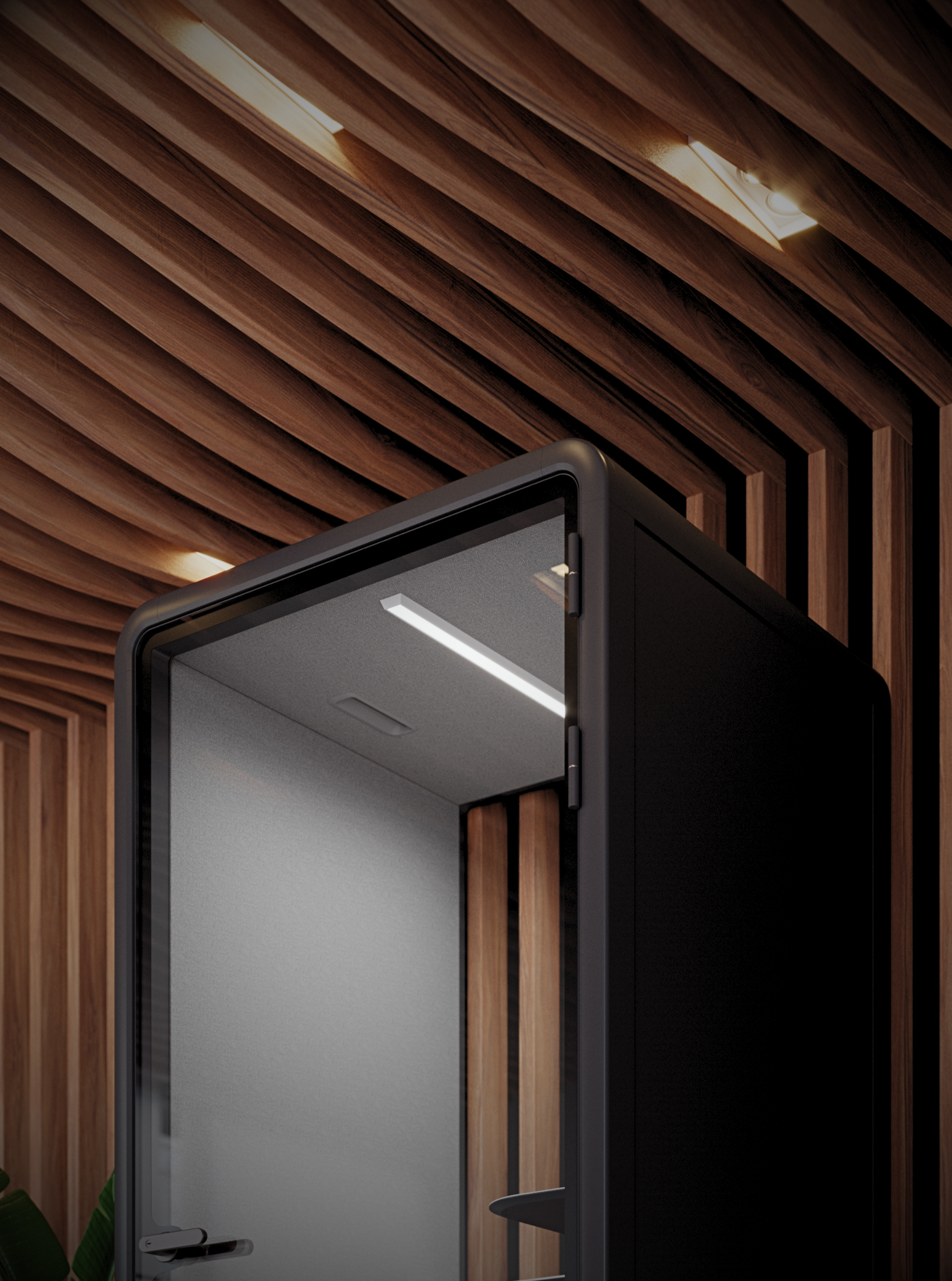 Our workspaces maintain balanced air pressure for comfort, with centrifugal fans providing quiet, smooth airflow. Automatic ventilation every 30 minutes keeps the booth fresh, while acoustic air ducts with sound-absorbing materials minimize noise, ensuring a comfortable, office-like environment.