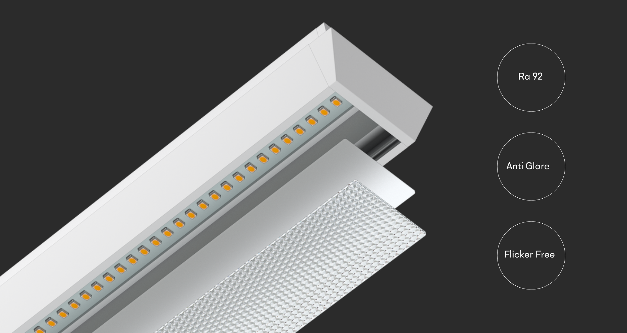 With the OSRAM LED module and glare-reducing prismatic lenses, the Aura pods deliver a CRI of 92 for true-to-life colors, minimizing eye fatigue and enhancing visual accuracy with flicker-free lighting, promoting focus and maintaining eye health during long work hours.